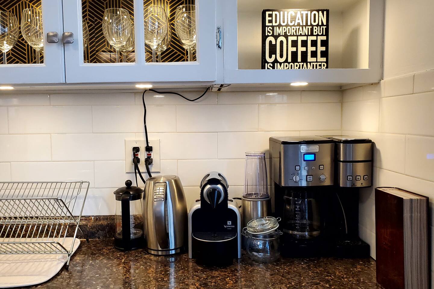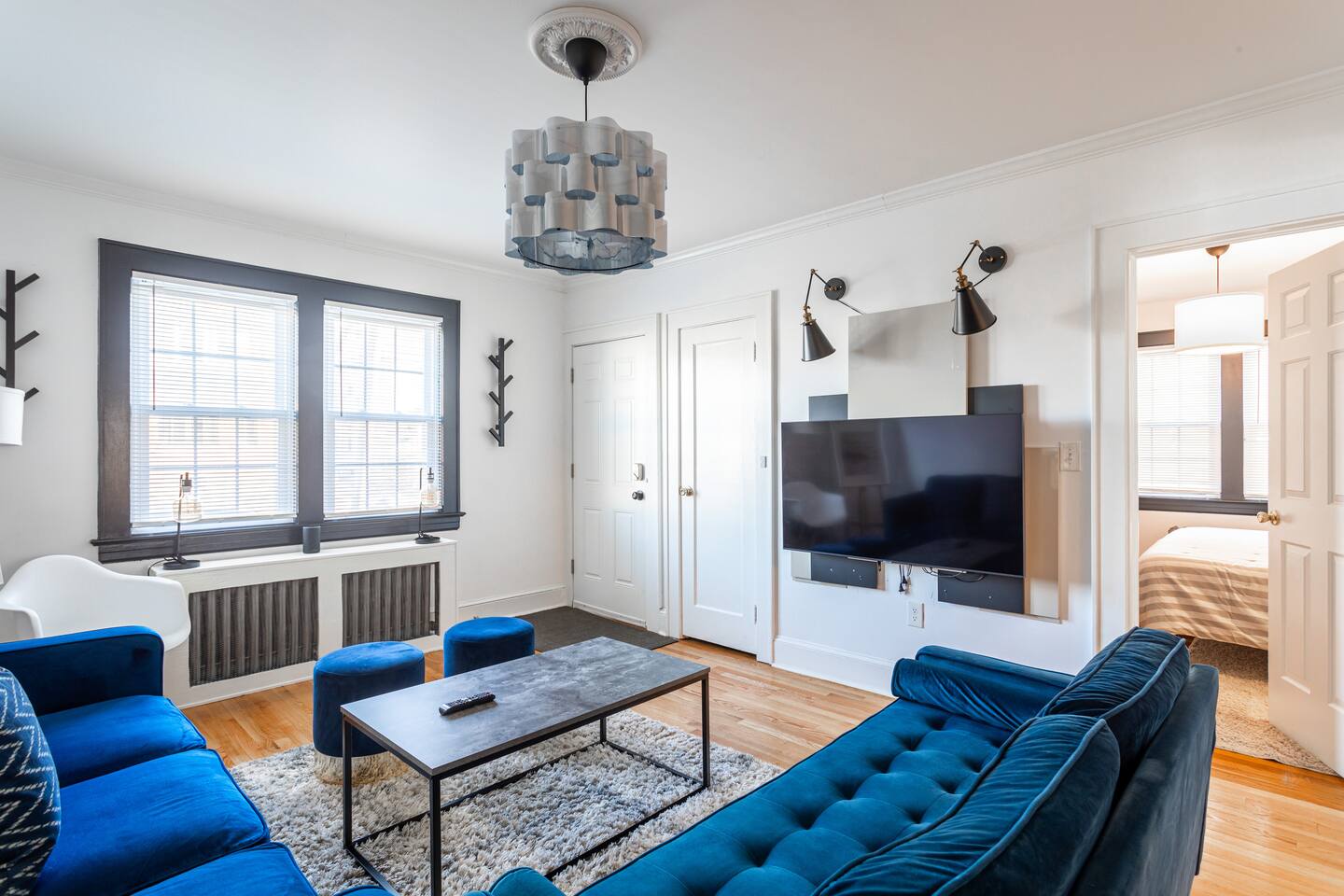 Indulge in the epitome of luxury with this breathtaking 2BR apartment. π Sink into plush blue velvet sofas, drift to sleep in sumptuous king beds with TVs in every bedroom & living room. Bask in the warm glow of beautiful lighting throughout. Savor a delicious cup of coffee at our coffee bar, and entertain guests in our spacious backyard. Nestled in the heart of the city, this is truly a rare find that you won't be able to resist. Book now to experience the ultimate in comfort and style. π‘β¨